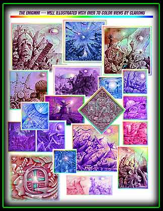 Conceptionalizing The Enigmni... The Enigmni began almost as a dream back in 1964 while Cook was a student of Graphic Arts at Texas State University. He was examining a halftone screen in an offset printing class when he observed the moire pattern formed visually when many screens were placed upon one another. To Cook, it looked just like the waves formed by Holographic plates. Cook began thinking about a universe that is manifest by broadcast into a physical state. Light was its source and he knew who the Light was. As the years went by, he started dreaming of a past that started at the seat of Time. "When I look back, I started Enigmni over 40 years ago," states Cook. Little by little, he began writing and sketching ideas. Then in 1965 he did a painting that he called "Star Gate" now owned by J. Tom Martin. Many of Cook's students and friends can long remember him speaking of the mystical Moire Matrix. He even taught a short class on the concept in his advanced design classes at Angelo State University back in 1974-'77. Guy Bachman who worked with Cook at the Pitluk Group Advertising Agency in 1980-81 often asked, "how the Moire Matrix was doing today?" Over those years, a flood of paintings began to develop in his studio and in his mind. "I came up with the title in 1981." ENIGMNI was a word he made up from a combination of Enigma and Omni. It means the absolute and ultimate Unknowable.
