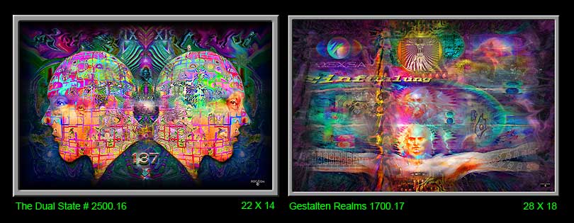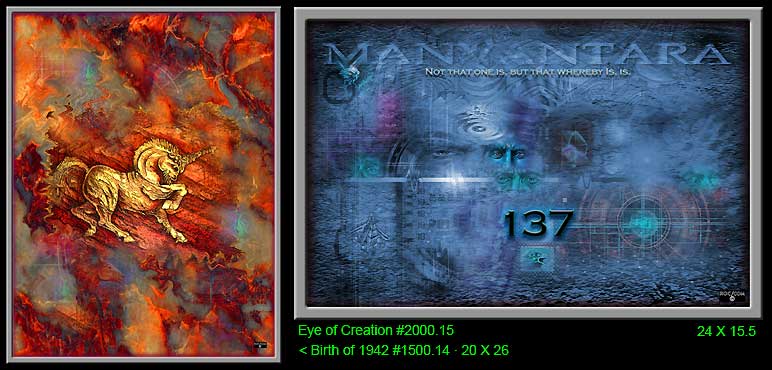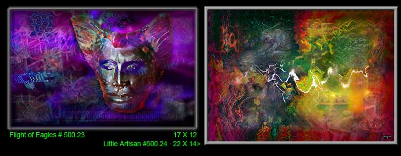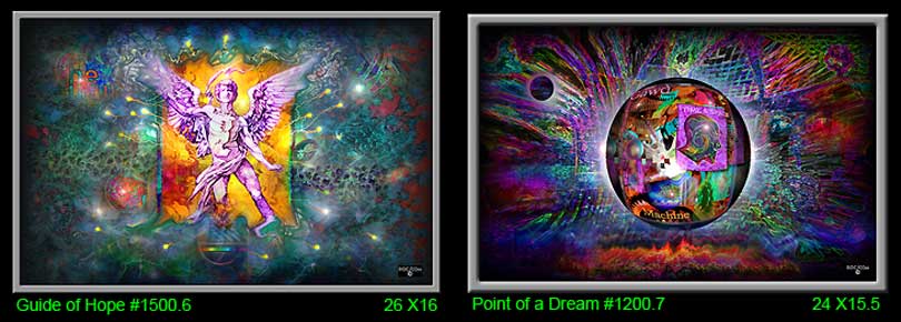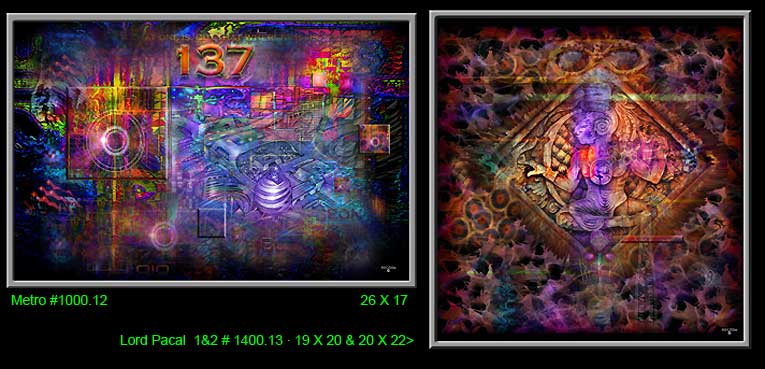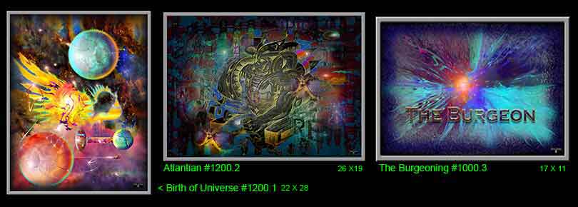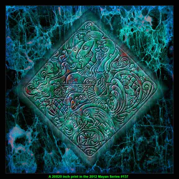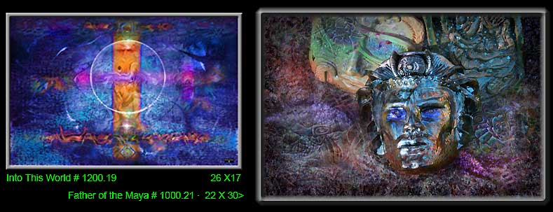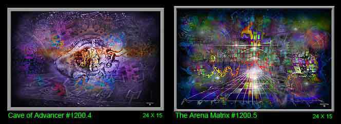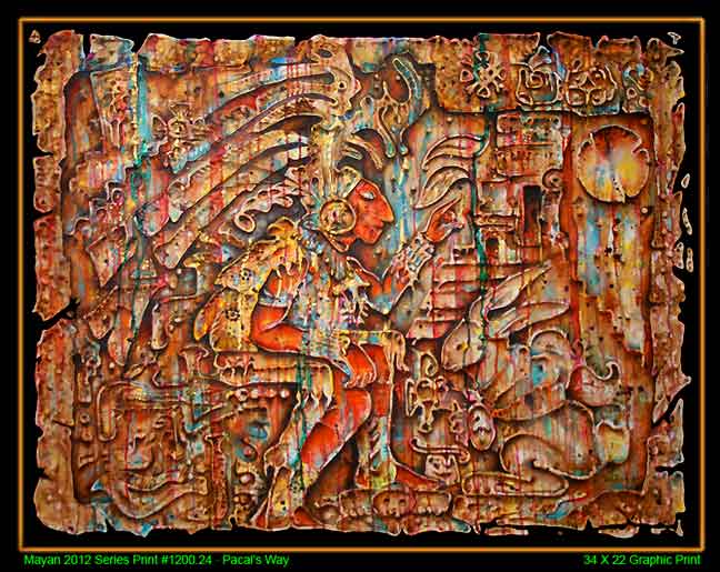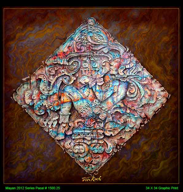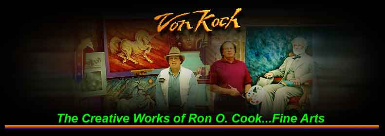 Ron O. Cook has done hundreds if not a thousand paintings since he was a little kid. He has painted almost every theme that the great masters ever tried and has taught such techniques to many of his students. His works are scattered all over the Southwest. Cook, who signs his drawings and paintings as "Von Koch" after his ancestors, has done many hundreds if not thousands of paintings, illustrations, drawings and portraits over a period of 35 years. His first commission was 32 major paintings in 1966 for a Houston Promoter. The non-objective paintings ranged from 5 X 12 feet to 3 X 6 feet in size. Thereafter, Cook's agent, J. Tom Martin (Houston Architect), helped place hundreds of paintings, drawings and prints in the surrounding Houston area for almost ten years. Cook prides himself as a painter who can accomplish any and all techniques of applying media to a surface. He has painted numerous realistic portraits, non-objective abstracts, and graphic surrealistic representations all in the same studio setting--switching from one work to the other in seconds. Much of his recent work has involved utilization of computers to develop his visual concepts. He has done this with some of his e-books, which are illustrated and many are in the process of becoming movie storyboards for future development. One such e-book, THE ENIGMNI, is found on this site. He is currently developing a new theme for his prints and paintings that stress the Alternate Viewpoint/s of past ancient civilizations especially those thought to exist some 10,000 to 15,000 years ago. One example of such creations is represented below. It is a representation of the 2012 Mayan Series of works that Cook has been involved with the past 15 years. The images below are sets of prints and those wishing to get more information on the prints may contact us at our e-mail address. Use heading: Ref: Art Prints. |