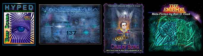 Creating Stuff... Some folks write and some illustrate their concepts. Ron Cook has got to see it in his mind's eye before he puts it down on paper as a picture or words. He has been thinking gestaltly for much of his life. In 1963, while at the university, he formulated his "Moire Matrix" concept when he first started studying holography. It was a paradigm of the Holographic and Virtual Universe's existence. Eureka! When the flame caught, it began to engulf his thinking about all disciplines. He soon realized that it was all related to the information one receives via feedback looping from internal and external sources that determines the parameters of sensory thought. He realized that humans could leverage the tools of life for power and control of their environment and they wanted to have it NOW! He applied his theory to all aspects of buying and selling...It works (check out HYPED). Written Materials Section... 1. HYPED or Human Leveraging 2. Deep Articles on Human Thought Patterns 3. Excerpts from the CRUX OF BEING 4. THE ENIGMNI...Cook's Meta-Fictional account of the Origins and Workings of the Universe